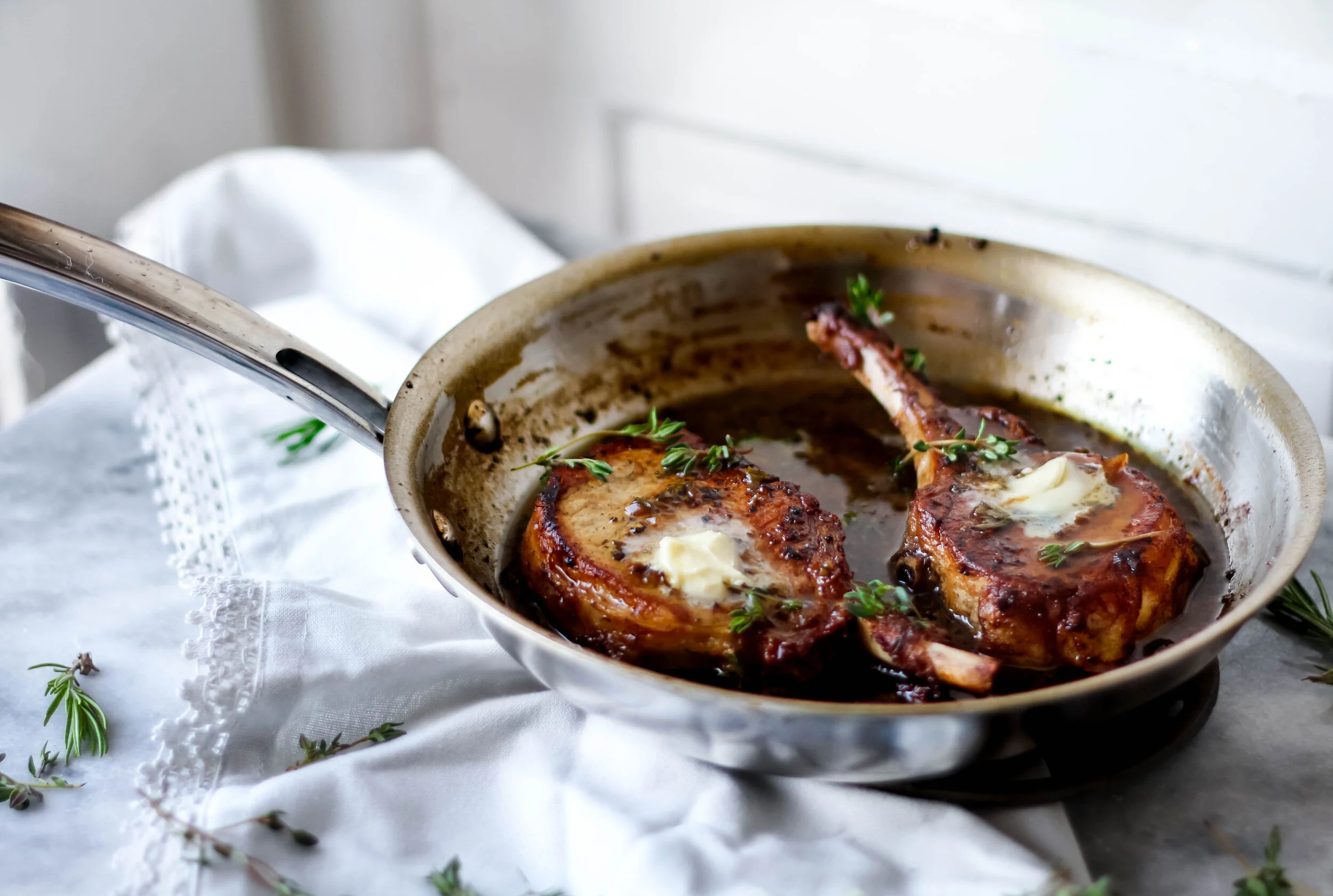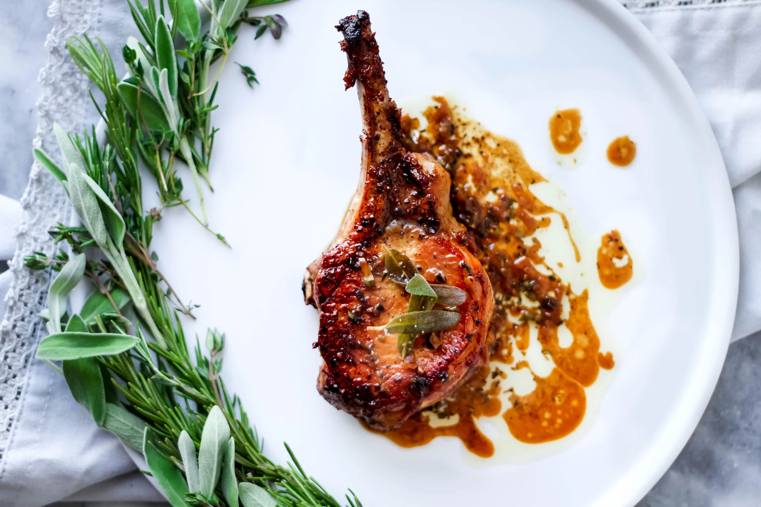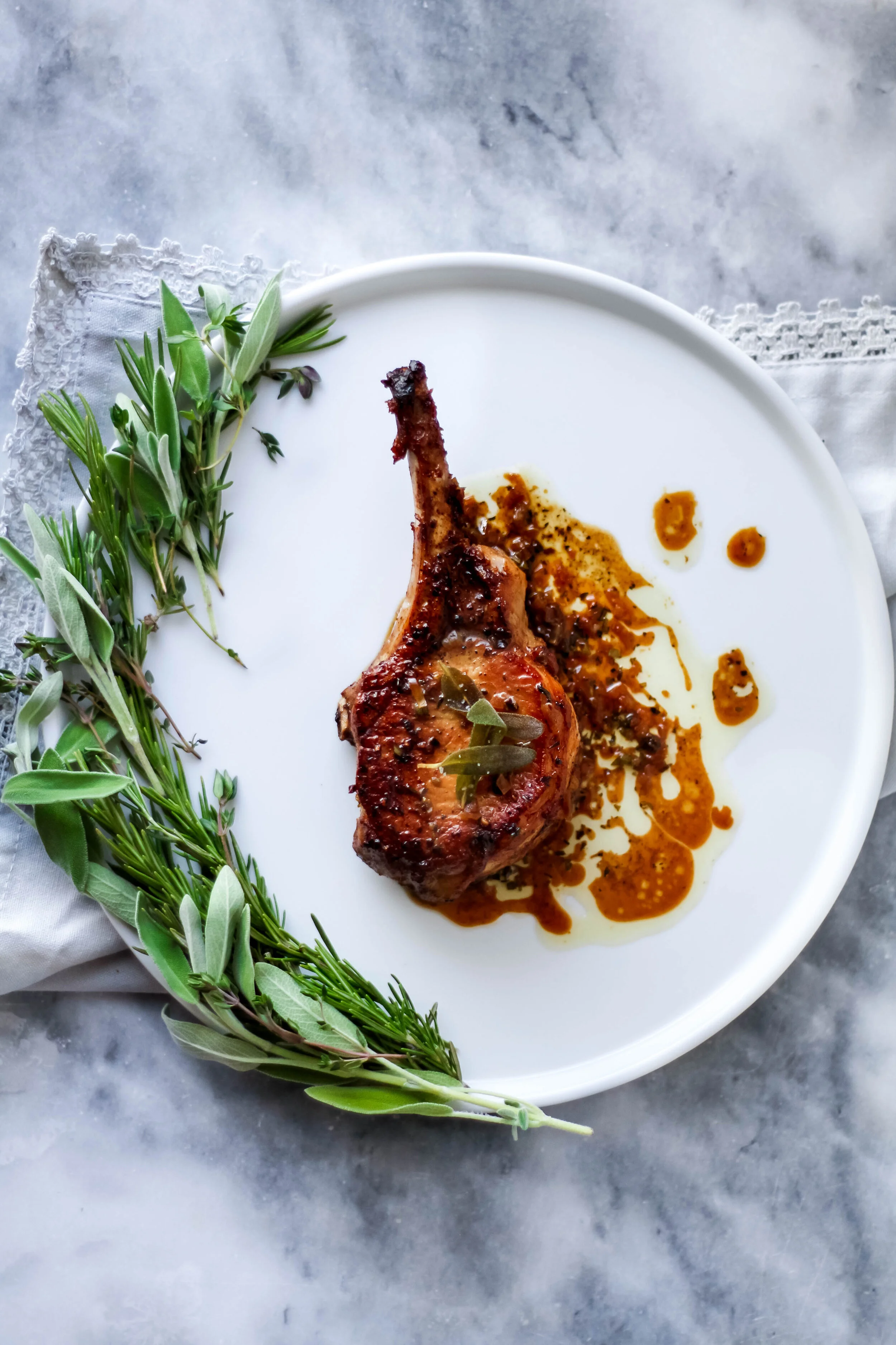 Pan Seared Butter Braised Pork Chops with an Herby White Wine Reduction