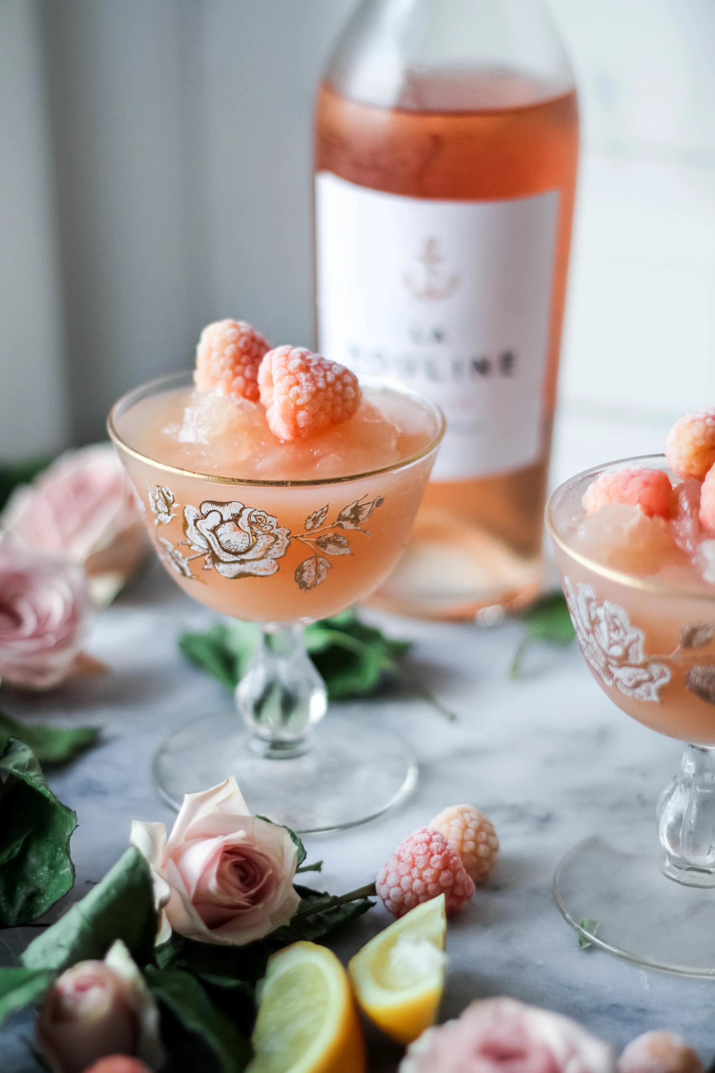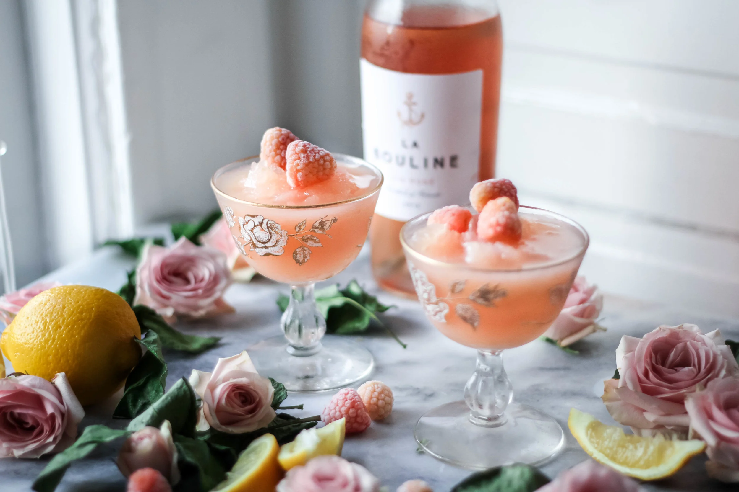 Once rosé is frozen, place rosé ice cubes into a blender, along with the lemon juice, frozen raspberries, vodka, and a cup of the remaining rosé.