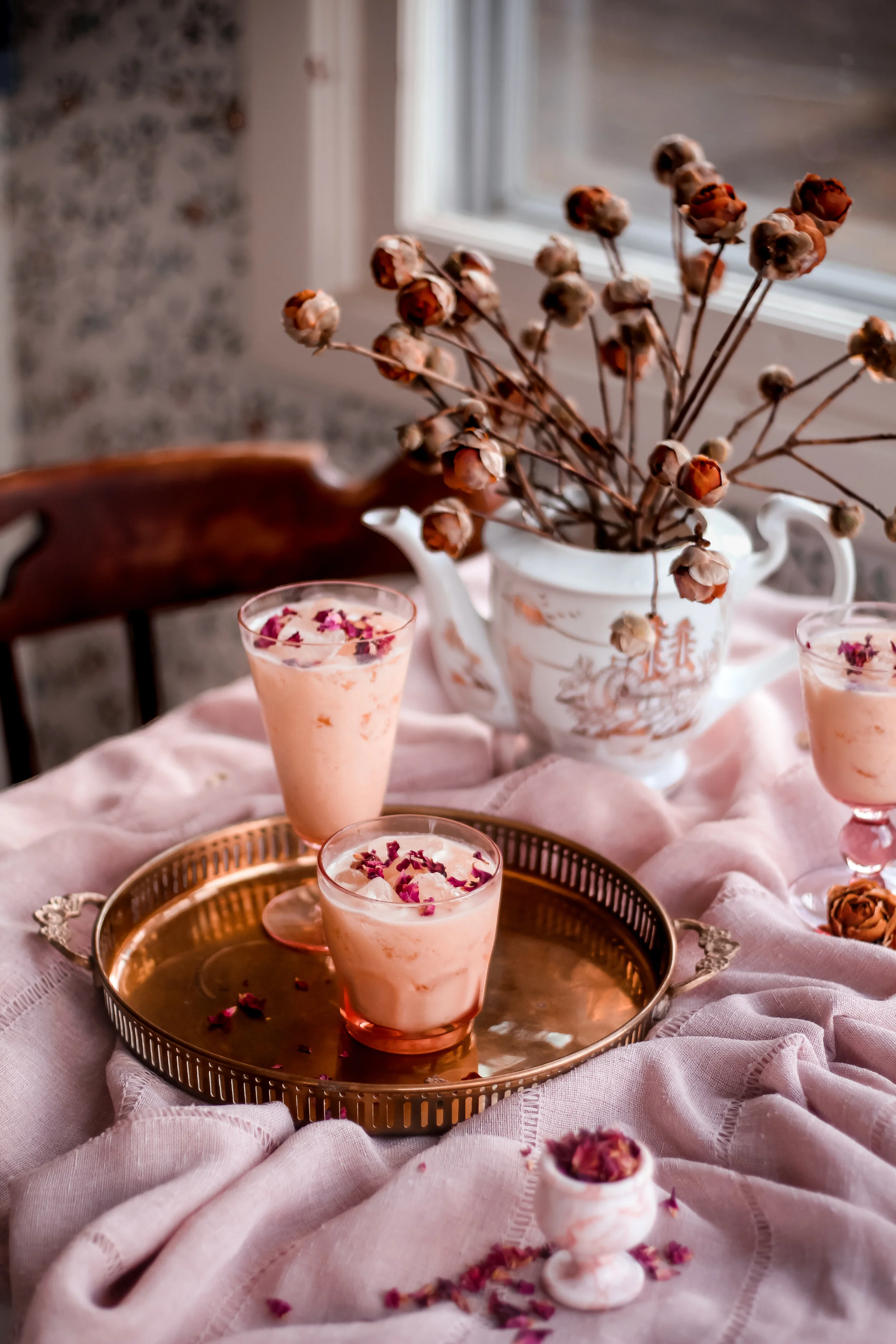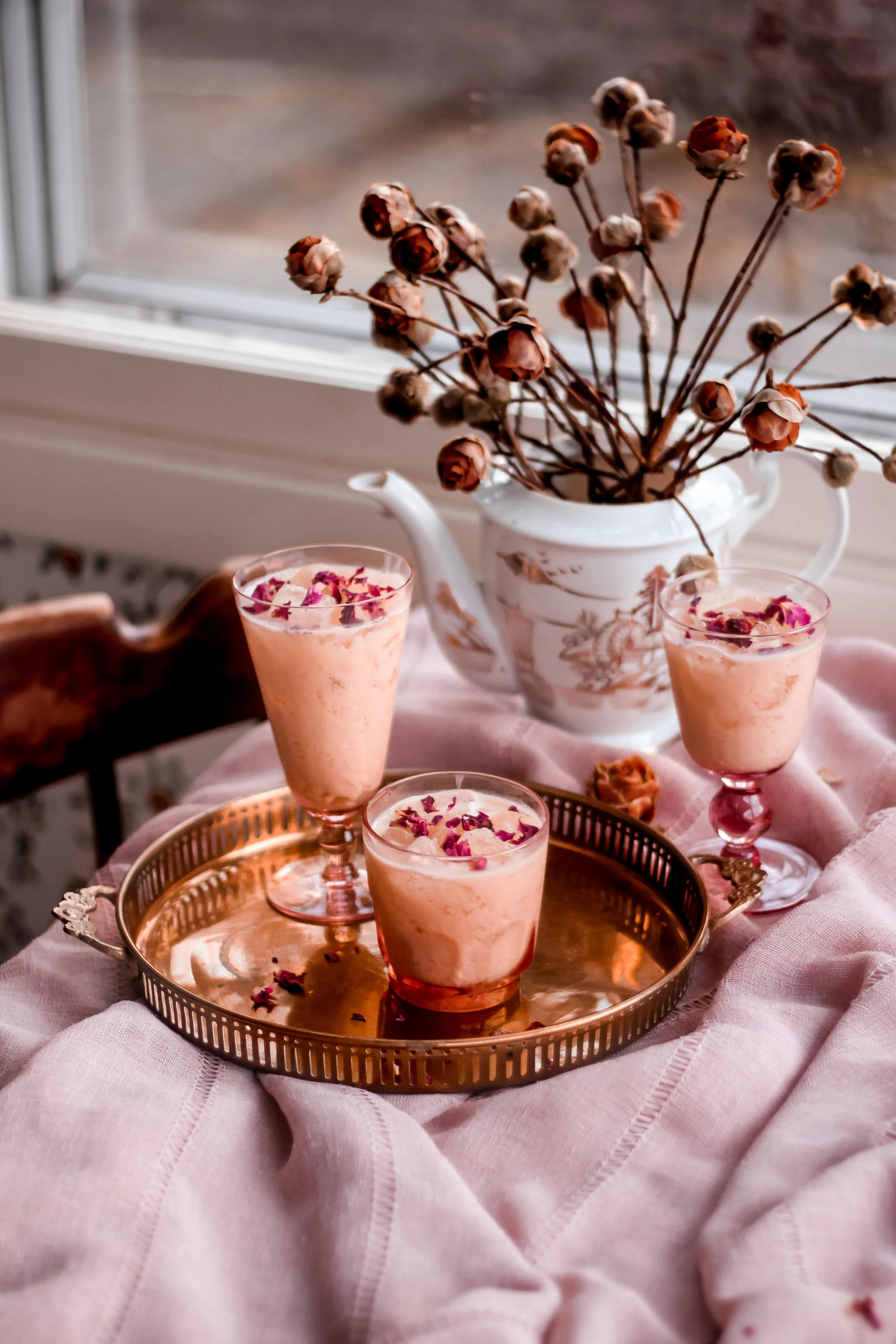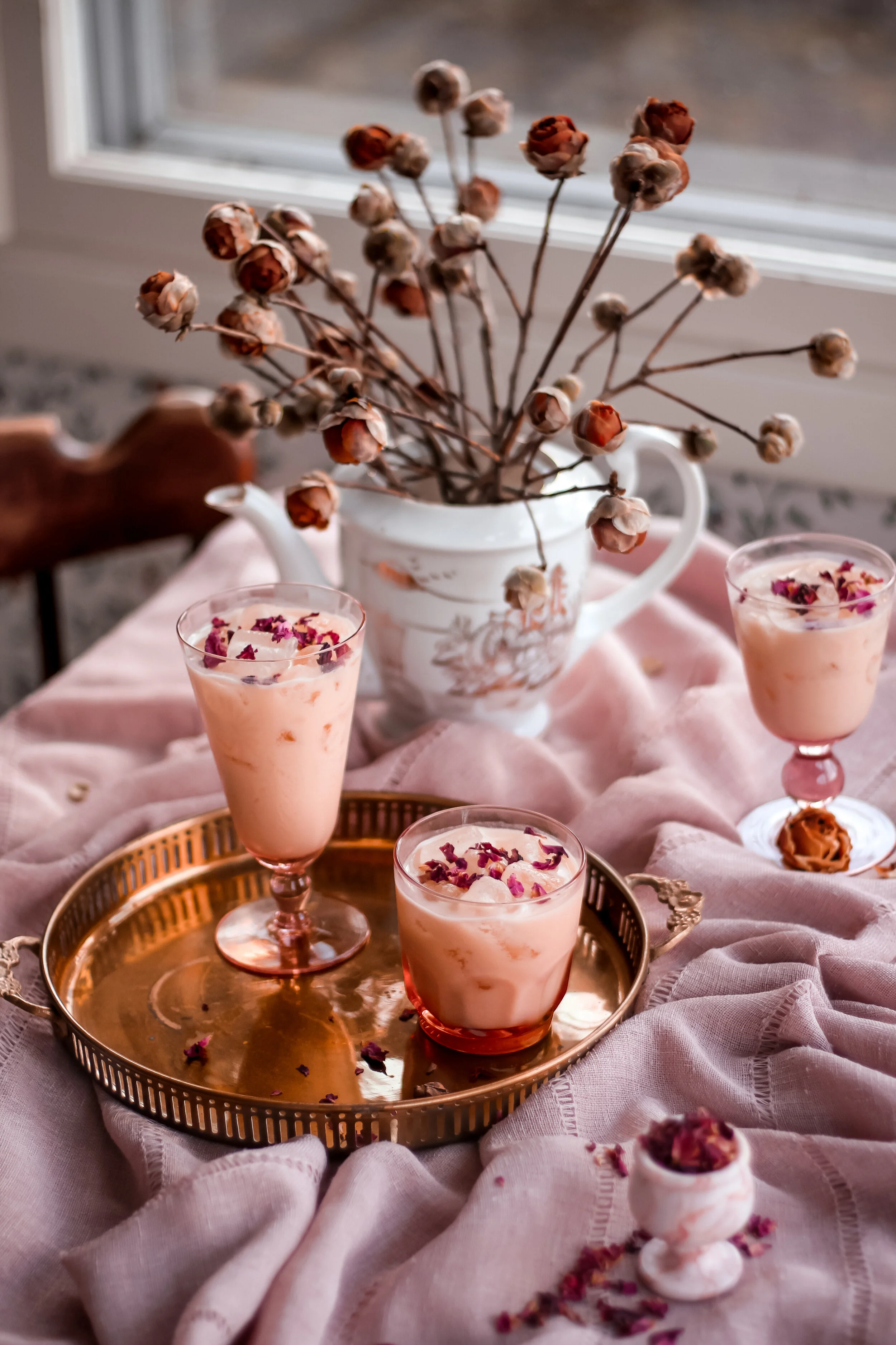 Optional garnishes: dried rose petals or lemon peel