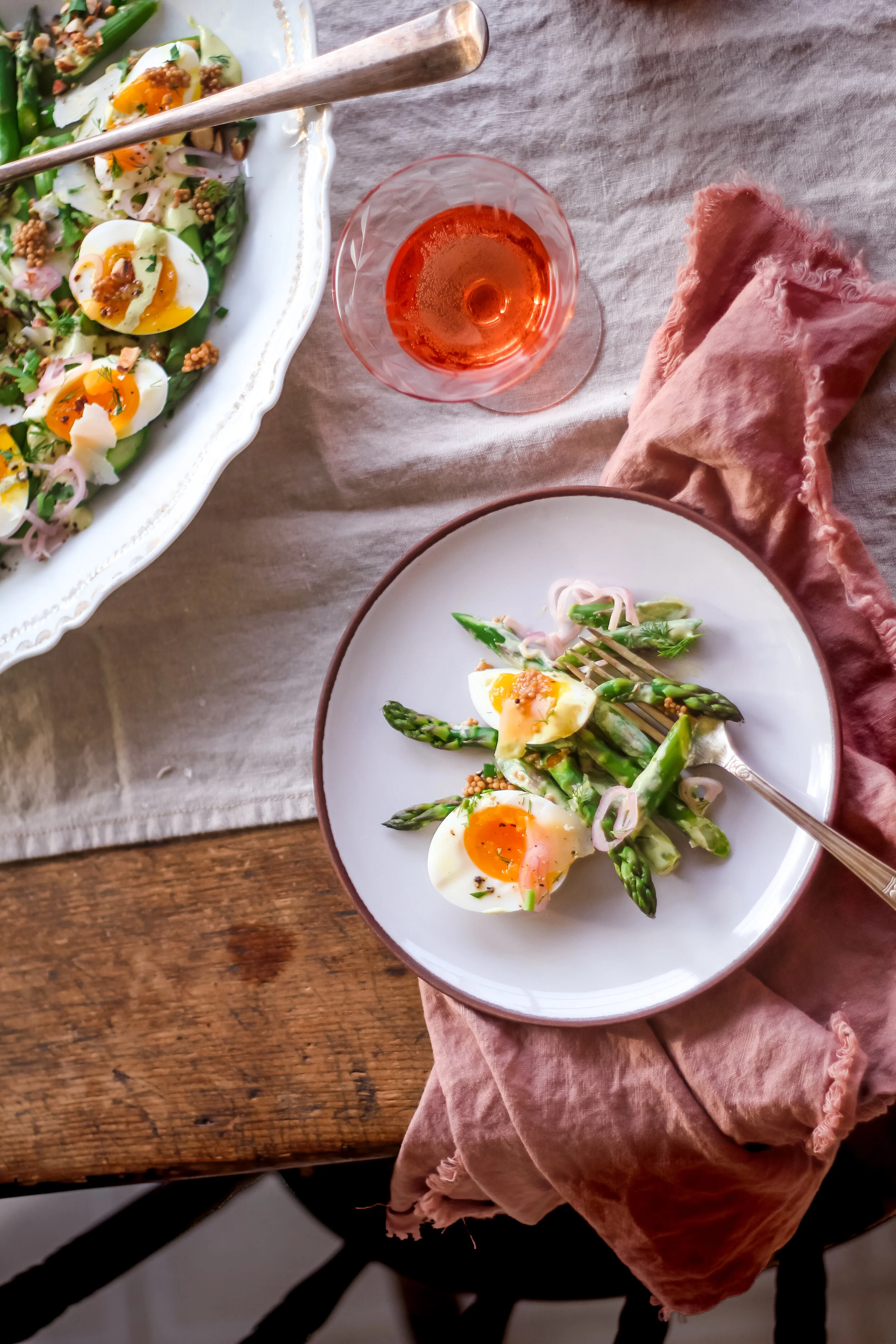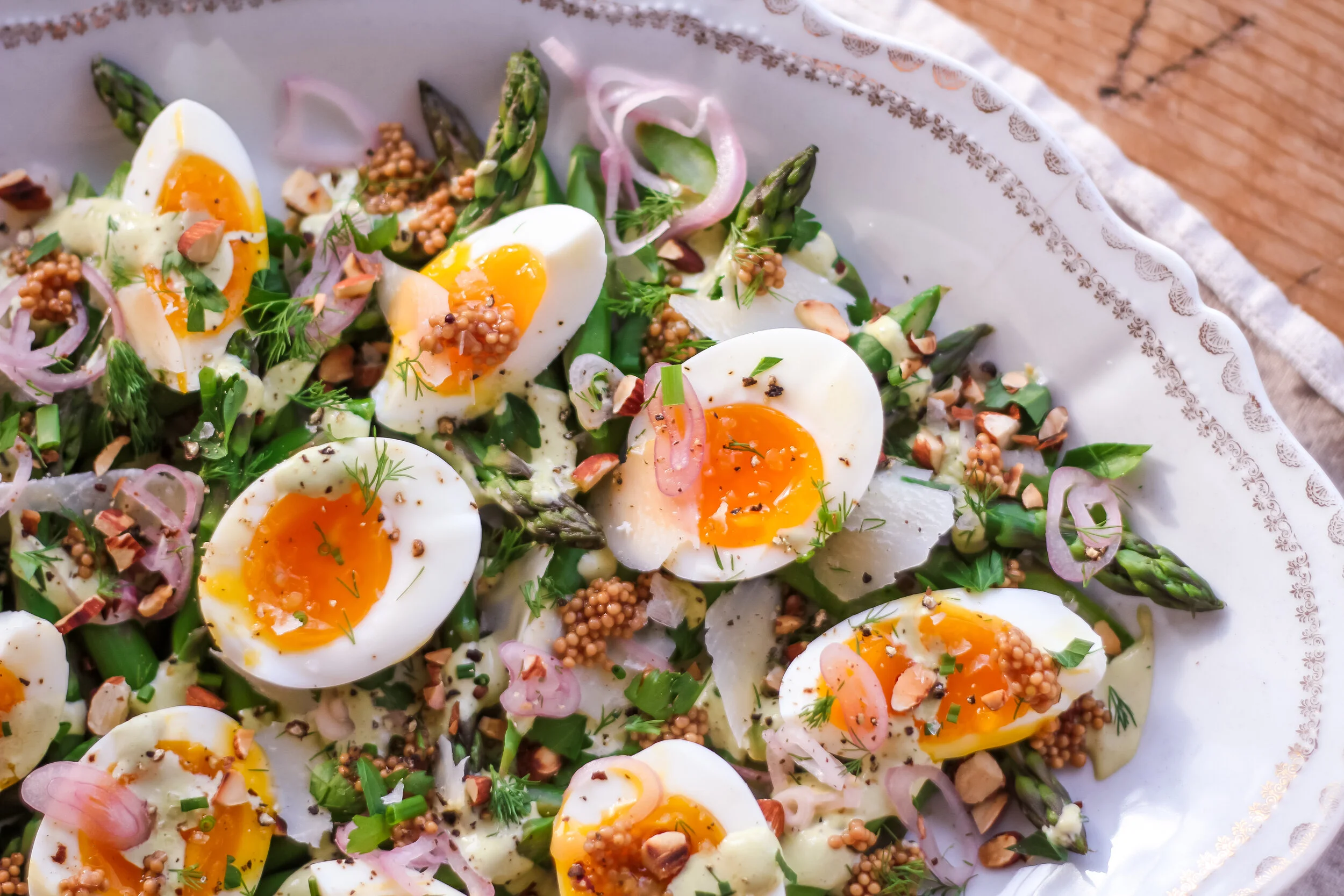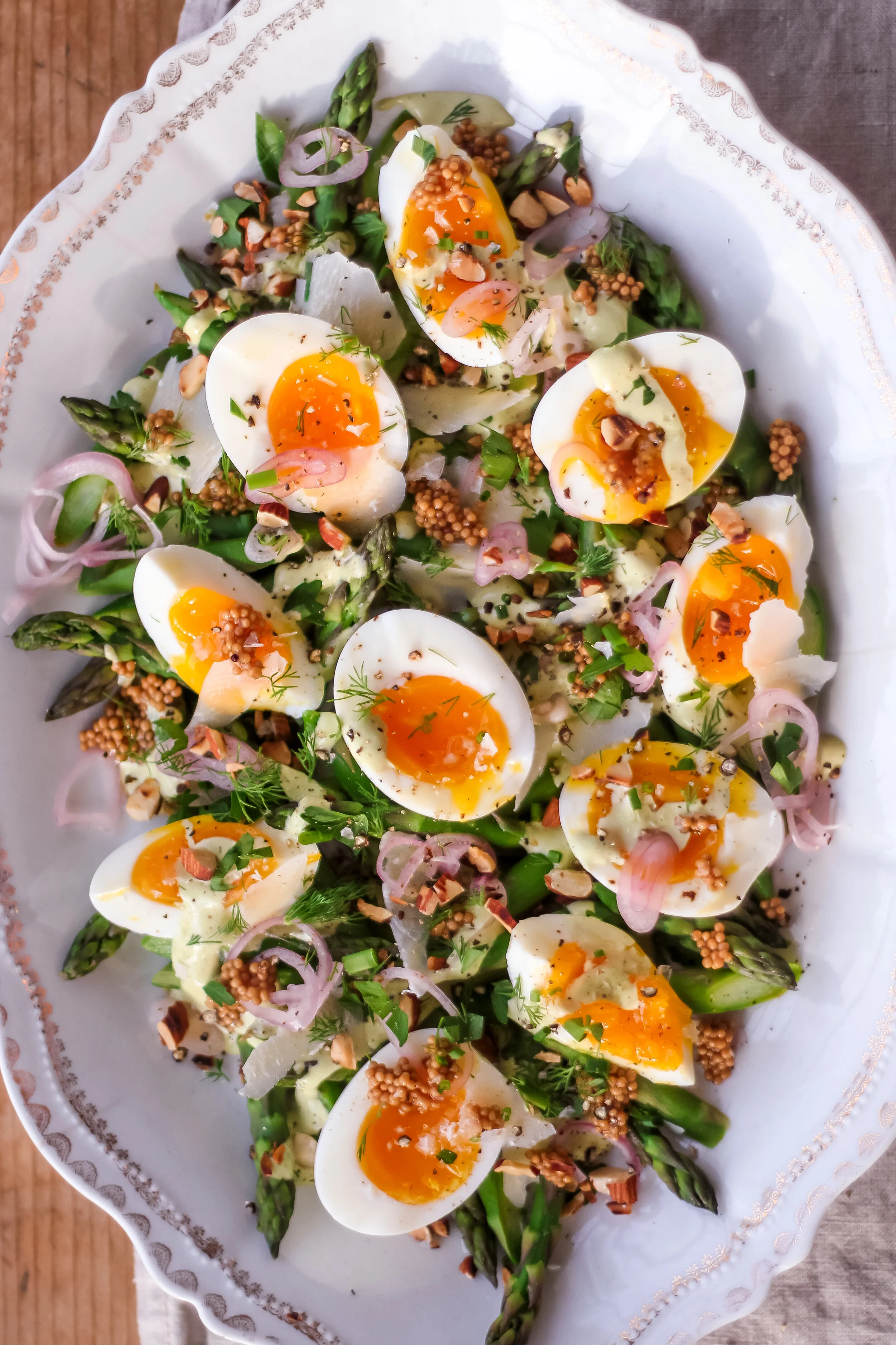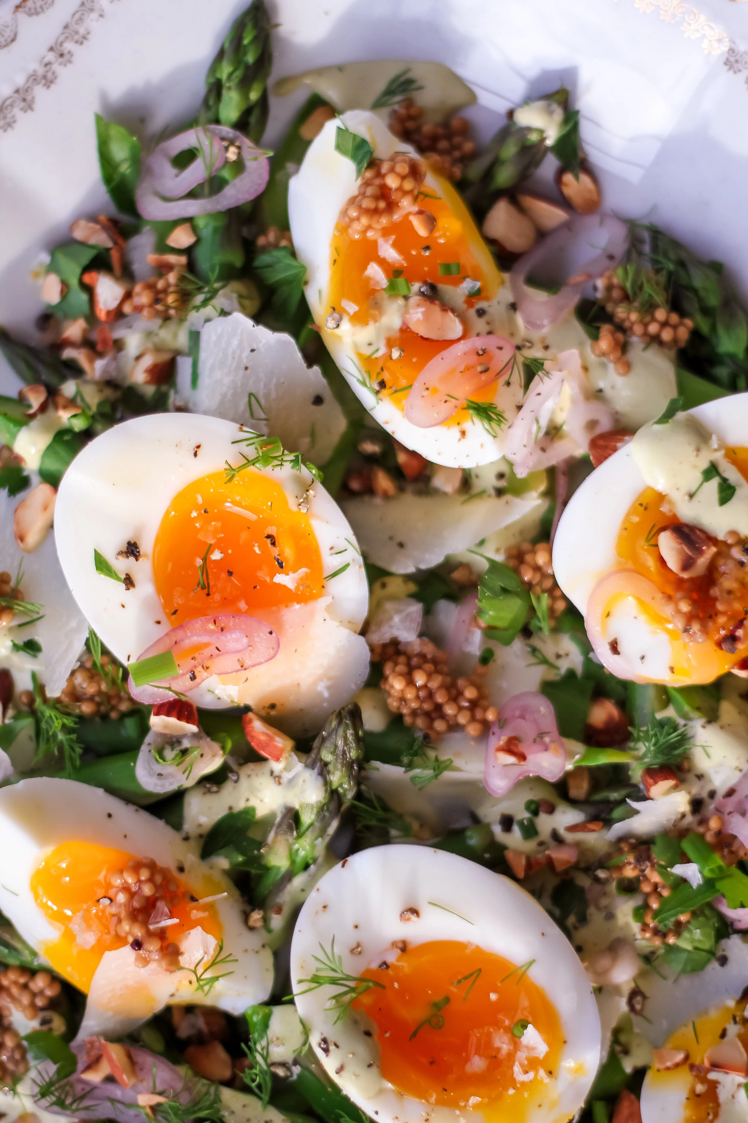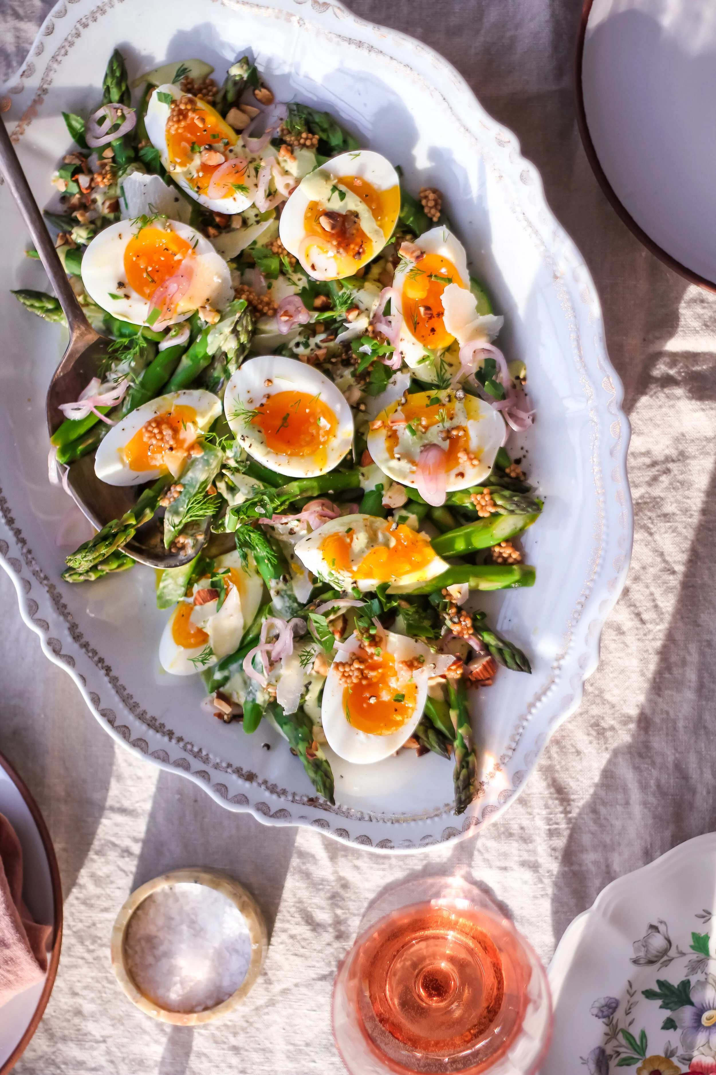 - Arrange asparagus on platter and add peeled jammy eggs cut in half or quarters or a mix of both! Then garnish with dressing, pickled shallots, parmesan, pickled mustard seed (if you have it), herbs, toasted almonds, grind some pepper on top, add a sprinkle of flaky sea salt, and serve!