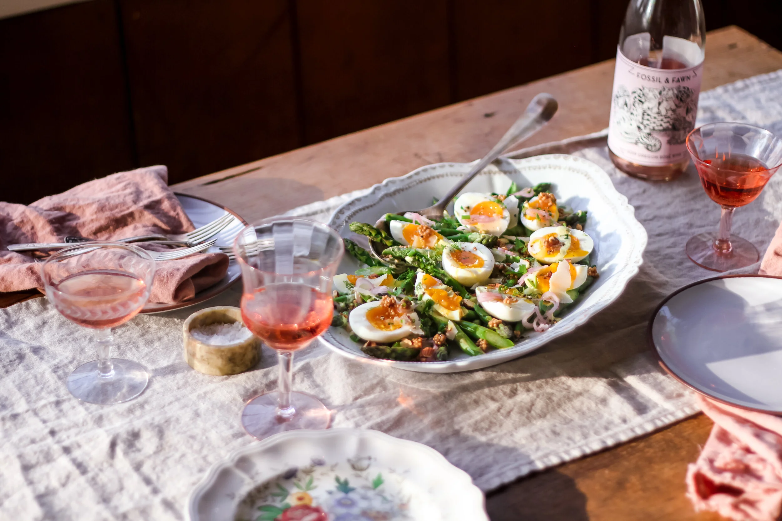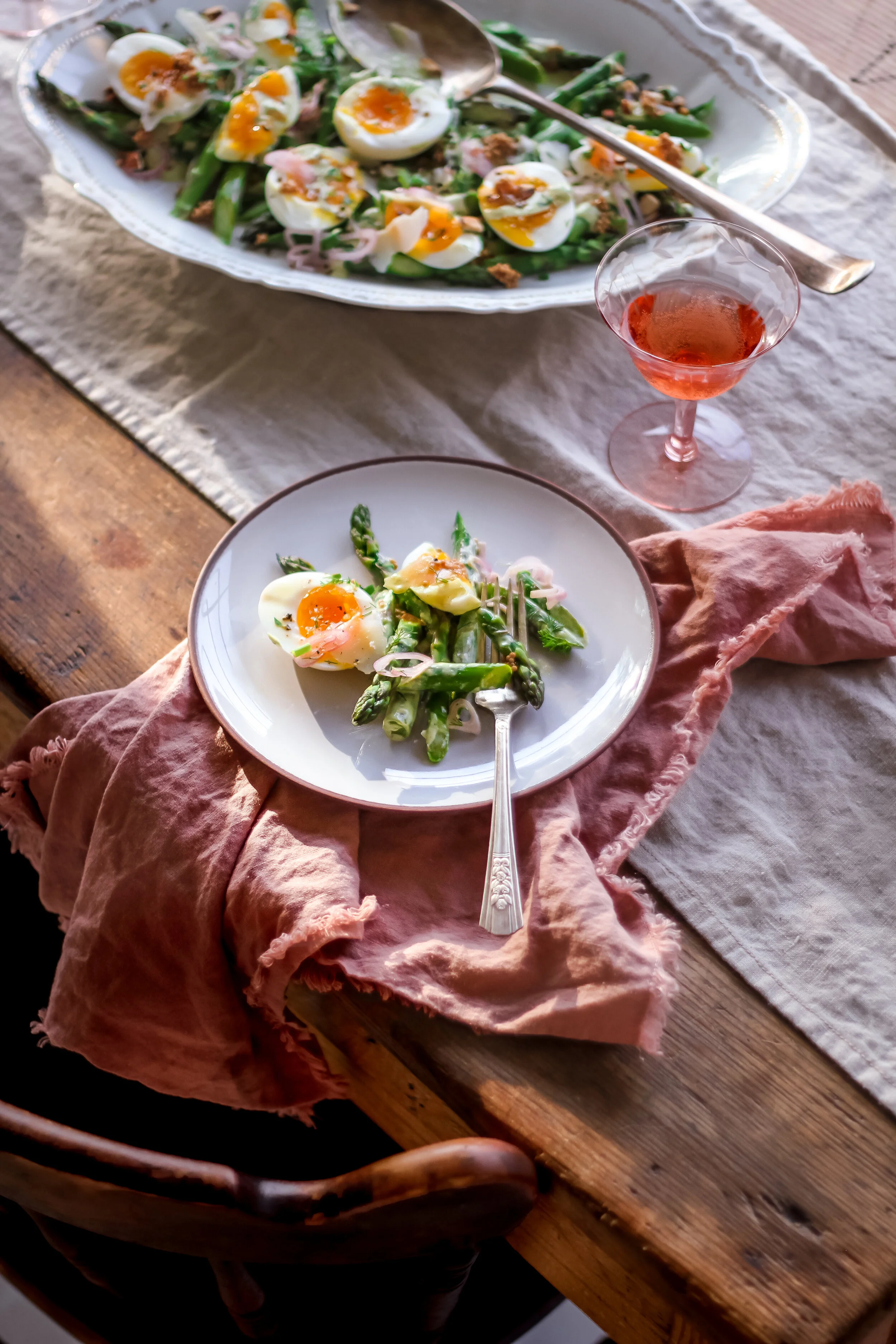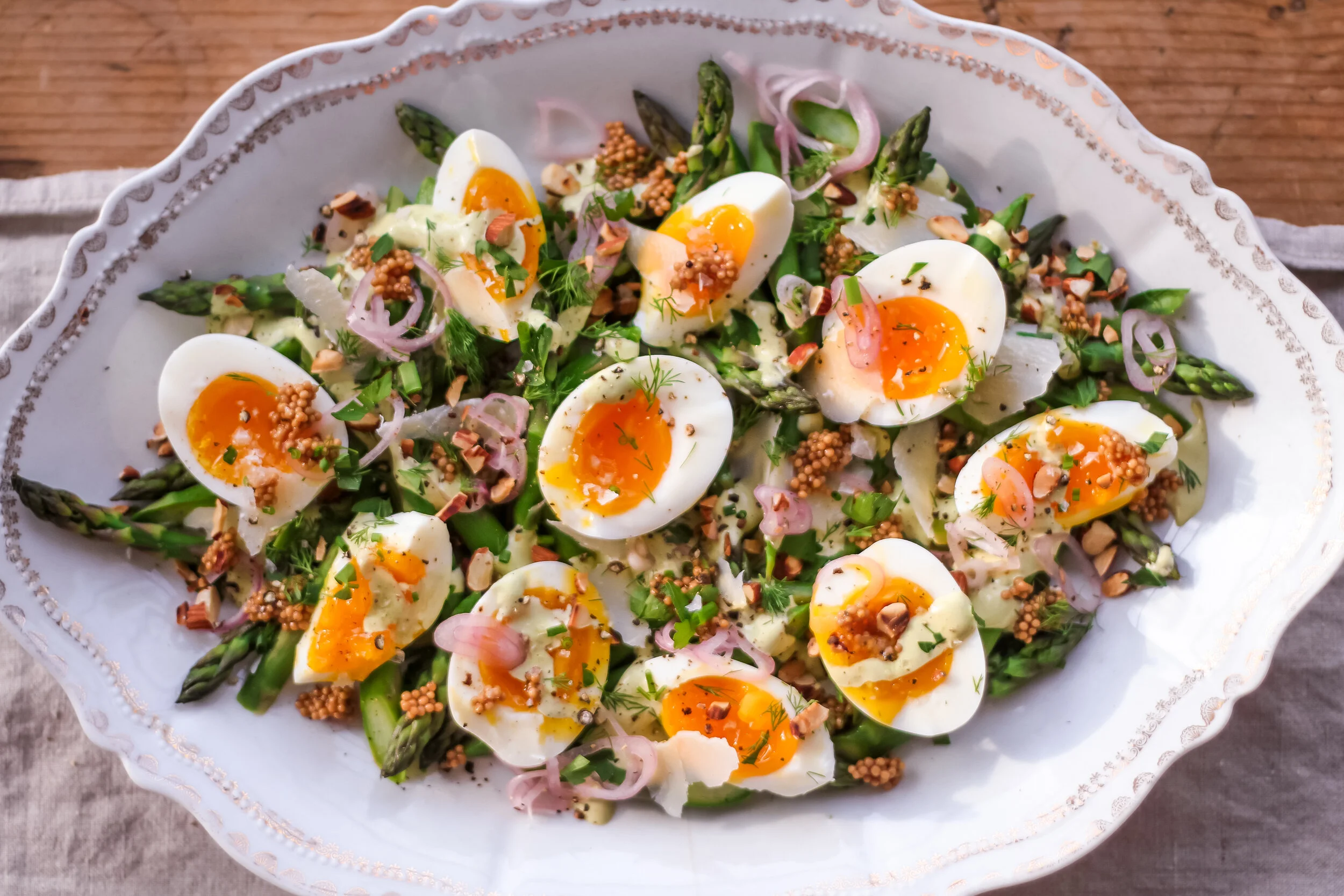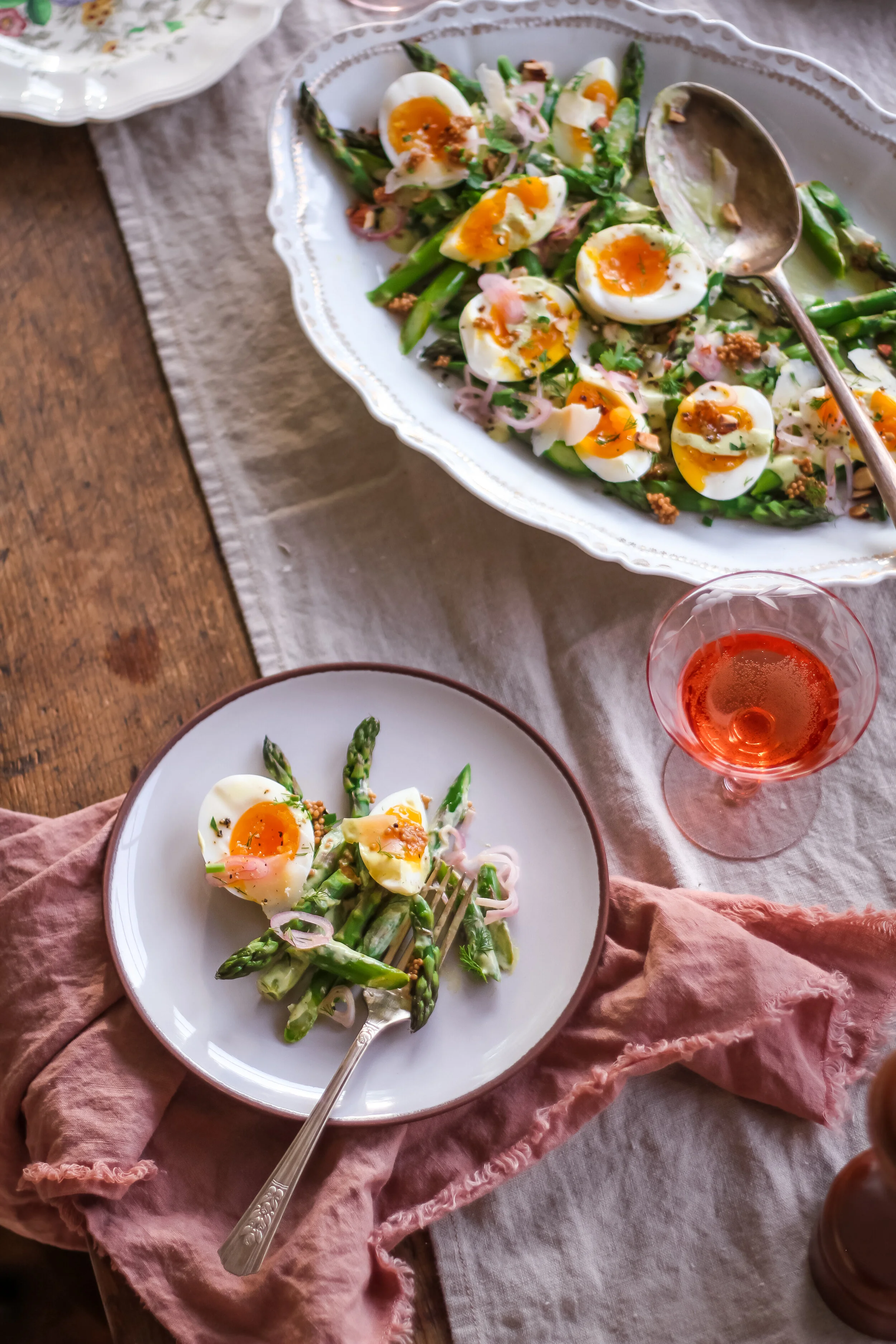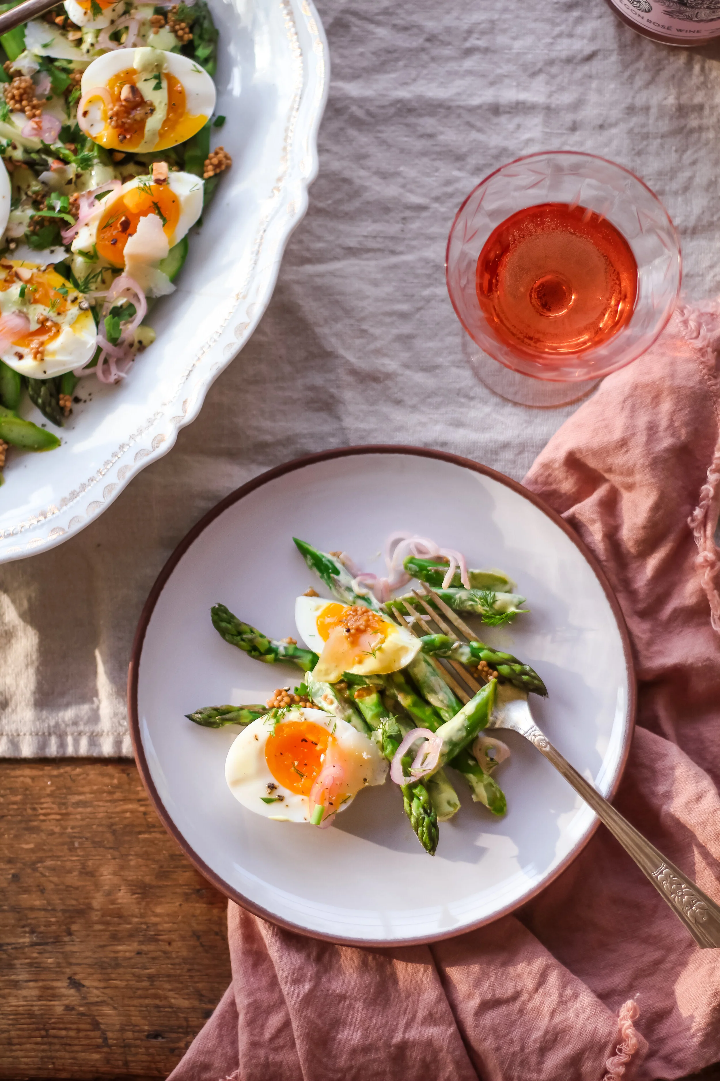 - Arrange asparagus on platter and add peeled jammy eggs cut in half or quarters or a mix of both! Then garnish with dressing, pickled shallots, parmesan, pickled mustard seed (if you have it), herbs, toasted almonds, grind some pepper on top, add a sprinkle of flaky sea salt, and serve!